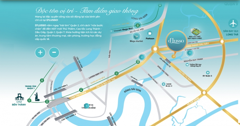 Ngoài nằm tại những trục giao thông chính của Quận 2, D’Lusso còn nằm ở vị trí trung tâm các khu đô thị lớn tại Quận 2 như: