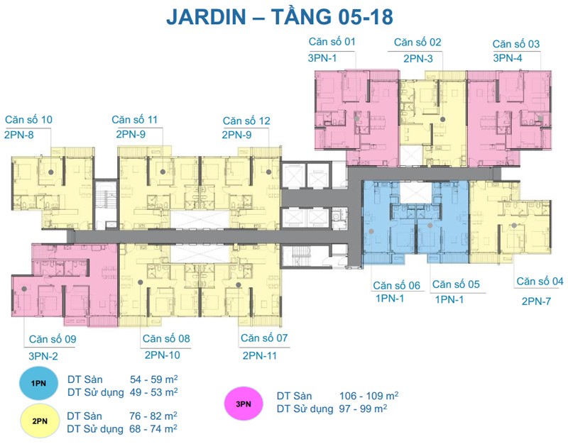 ► Cũng giống như tháp Jardin, các căn hộ của tháp Ciel được bắt đầu từ tầng 5 đến tầng 18. Tuy nhiên, 1 khác biệt nhỏ tại tòa tháp này là 2 căn 1 phòng ngủ ở tầng 5 – 7 sẽ đổi lại thành căn 3 phòng ở tầng 8 – 18.